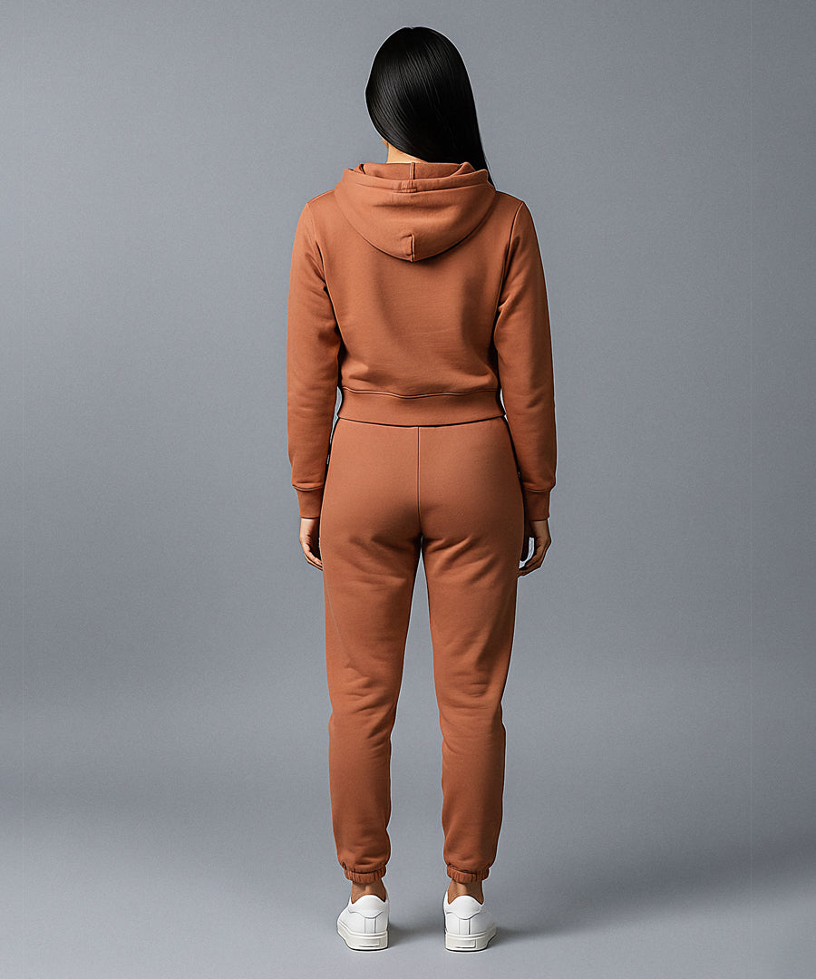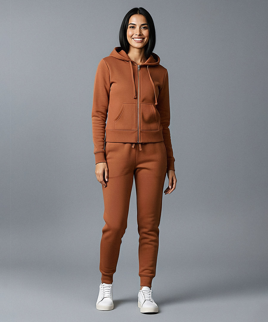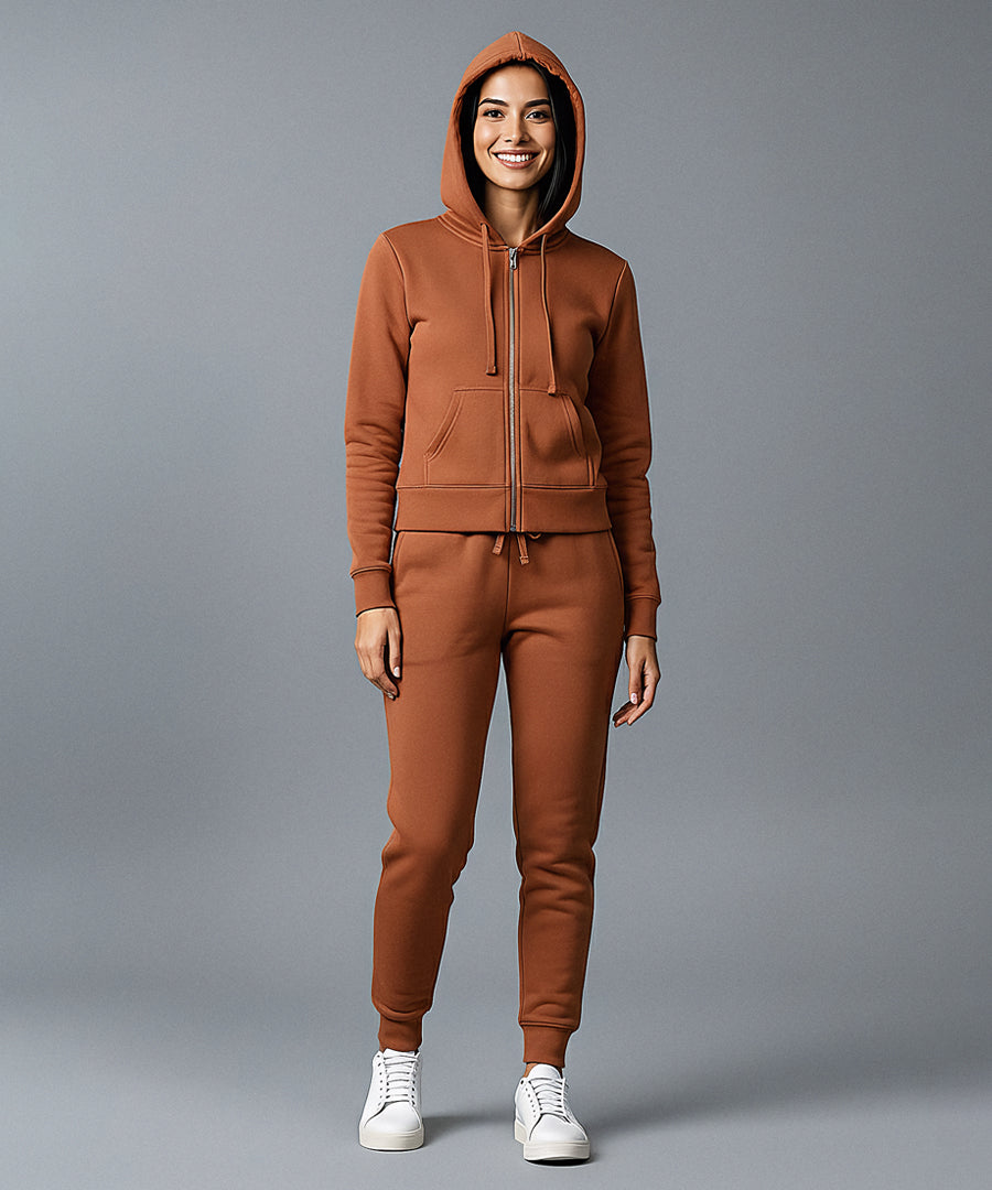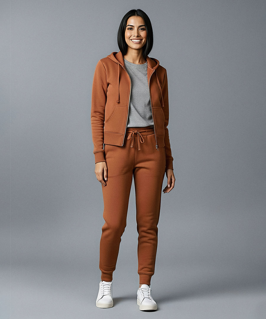 Pair a neutral zip-up hoodie with tailored joggers and a crop top. A minimalist sneaker seals the fit.